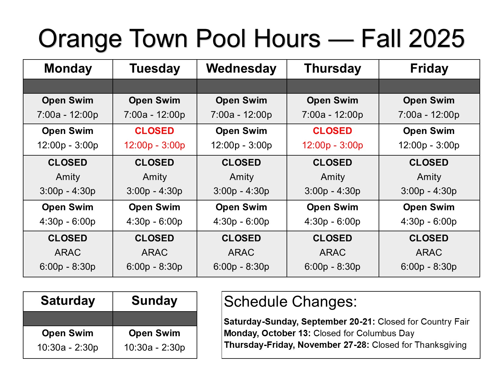 There is a 1:1 ratio for adults and non-swimming children. All children wishing to swim without a parent or the 1:1 ratio must pass the swim test (one full length of the pool without help or stopping). The guards are not allowed to make any changes or exceptions to these guidelines. Please contact Megan in the Park and Rec office for questions or concerns.